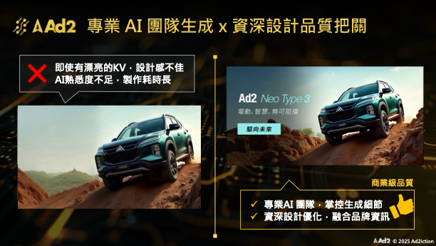 Ad2 聯播網廣告格式已全面支援 AI 素材應用,讓 AI 賦能廣告創意直接搭載於各類數位廣告版位,強化廣告主過去素材單一、貧乏等限制,讓 AI 生成內容真正商業化、應用於大規模廣告投放。這項創新不僅提升品牌行銷彈性,也讓廣告主能夠以更快速、更具成本效益的方式產出符合市場趨勢的動態廣告內容。AI 生成動態素材,協助品牌快速適應市場趨勢,提升廣告觀看率與點擊率。